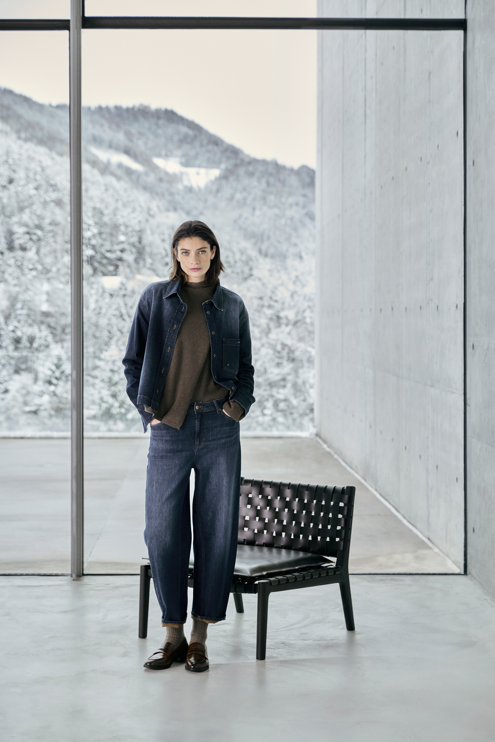 The fashion colour brown is also included in the denim spectrum. A dark blue denim shows its inner side and hem turn-ups in brown. A super authentic denim made from a cotton/tencel blend also impresses with its heavy, soft drape.