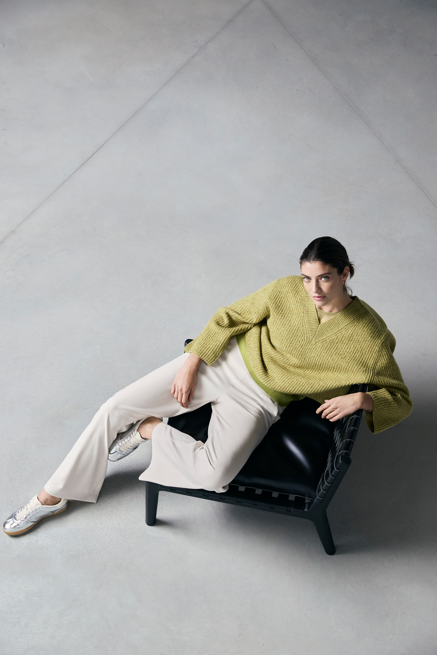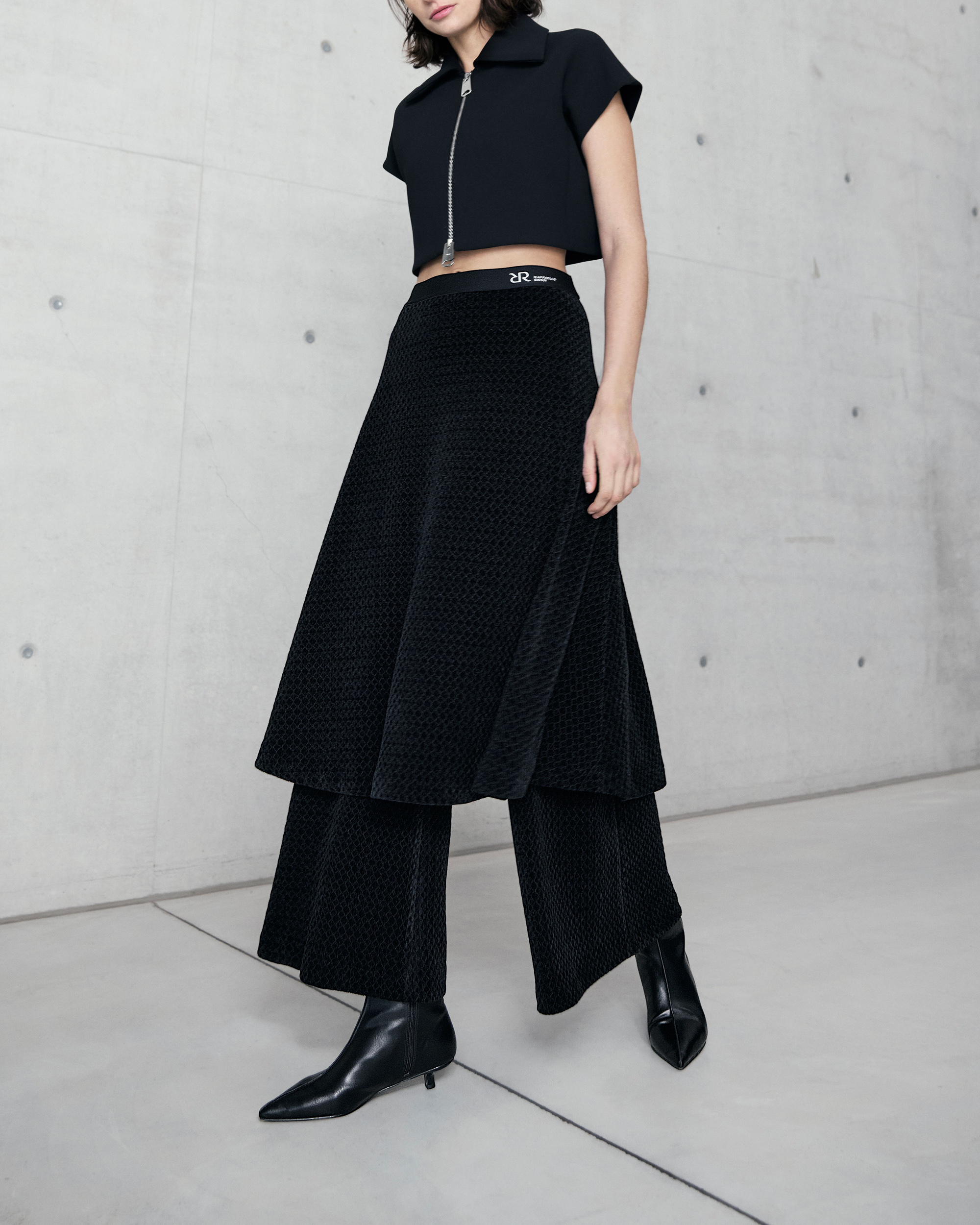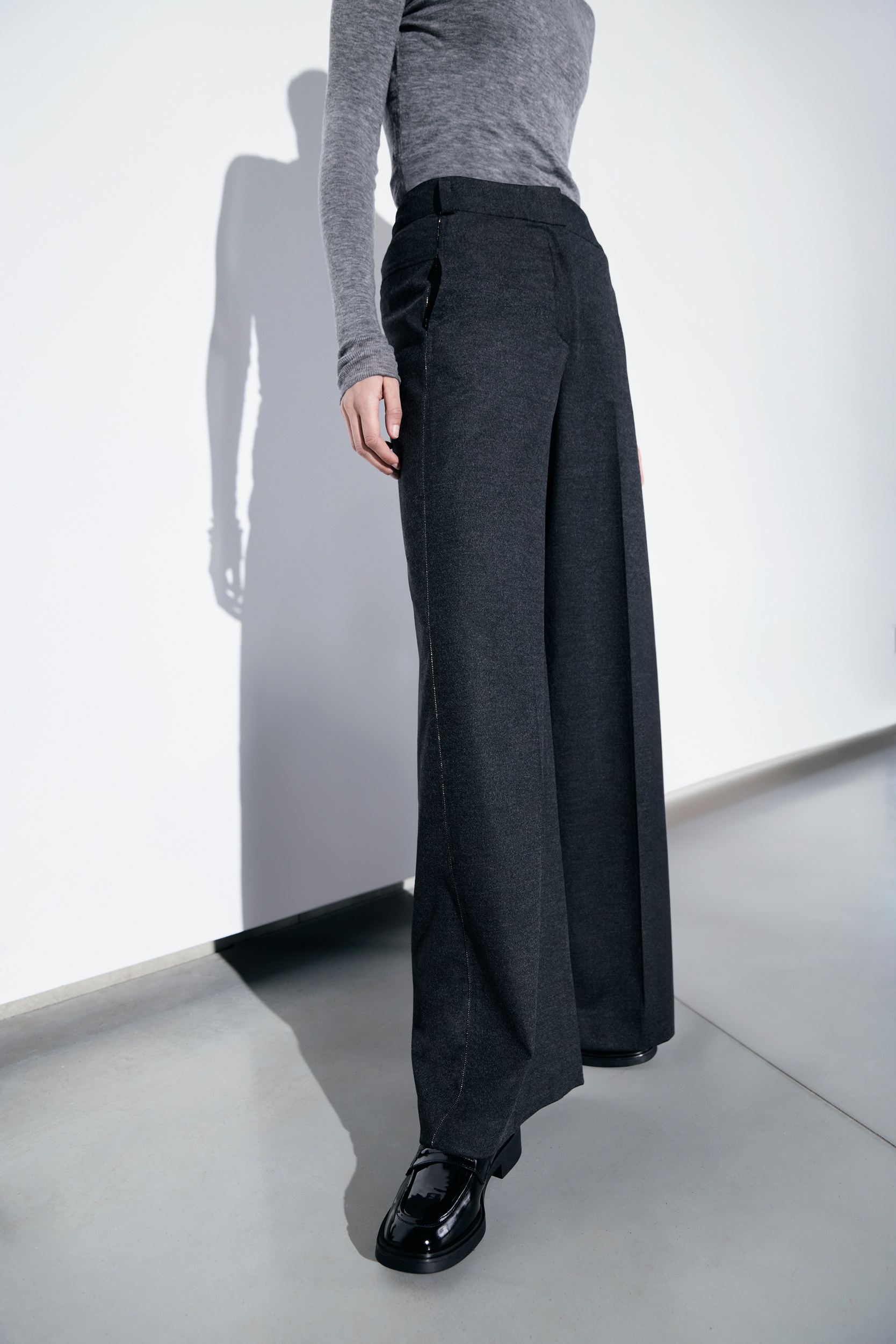 Nous entrons dans la nouvelle saison avec de véritables accroche-regards, comme par exemple une jupe et un pantalon dans un look « fringed fabric » ou un denim fluide en lurex dans une silhouette wide-leg.