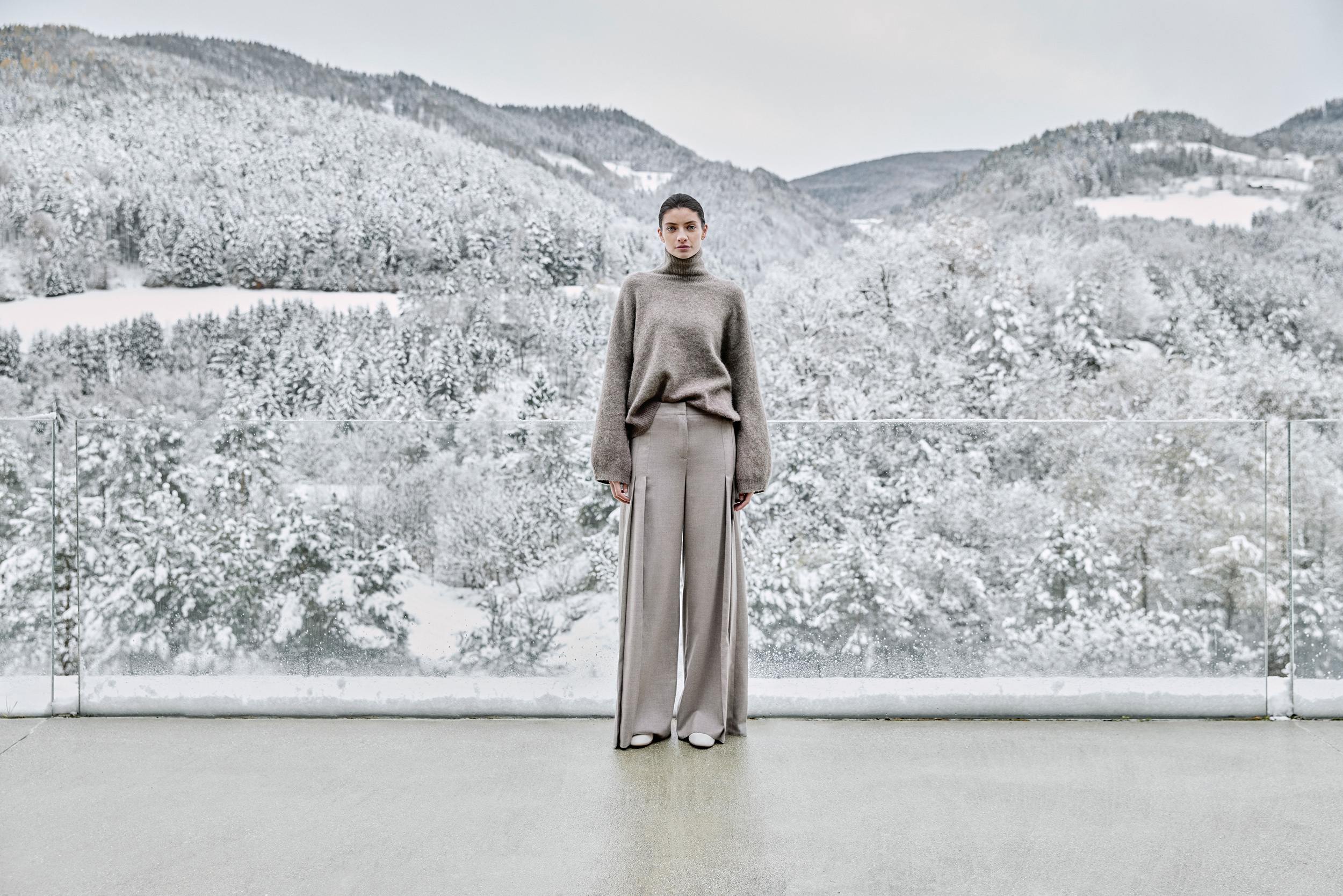 Ein verfremdeter und modernisierter Leo-Druck im Cashmere Touch bietet eine winterlich anmutende Neuerung für das Thema Druck für Midi Rock und Wide-Leg Hose.